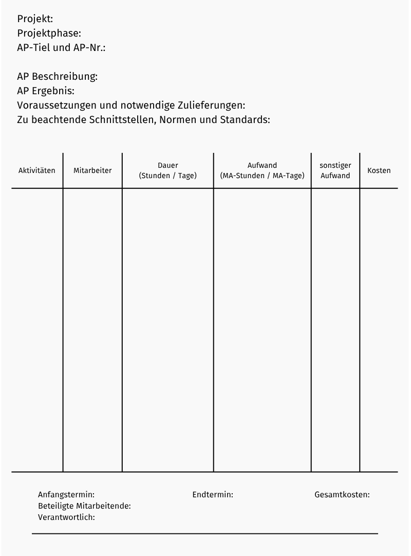 Wie im vorausgegangenen Kapitel behandelt, ist der Projektstrukturplan (PSP) in seiner Gesamtheit ein hierarchisch strukturiertes Gebilde, dessen kleinste, nicht weiter unterteilte Einheiten die sogenannten Arbeitspakete (AP) bilden. Diese sind in sich geschlossen, werden innerhalb des Gesamtprojekts geplant, gesteuert und überwacht und grenzen sich dabei durch klar definierte Zielsetzungen von anderen Arbeitspaketen ab.