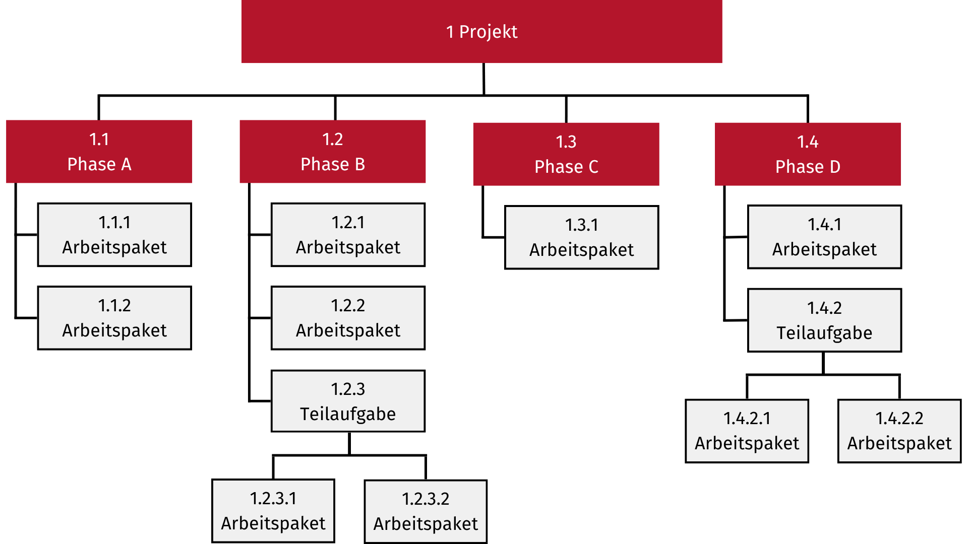 Weitere Tücken lauern auch bei der Strukturierung des PSPs: Ist dieser zu vage, wird keine klare Linie erkennbar und das Projekt kann schlimmstenfalls im Chaos versinken. Ist der PSP jedoch zu detailliert ausgearbeitet, schränkt er wie ein starres Korsett die Flexibilität im Projekt ein. Wie so oft kann hier also nur dazu geraten werden, einen für Ihr Projekt geeigneten Mittelweg zu finden. Zudem sollten Sie einen wesentlichen Grundsatz bei der Strukturierung niemals vergessen: Arbeitspakete sind immer die kleinsten Einheiten innerhalb der Hierarchie des PSPs und sind folglich niemals als einzelne, alleinstehende Aktivität vorzufinden, sondern stets den Teilprojekten und Teilaufgaben zugeordnet.